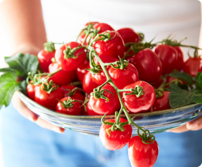 tomater med en meget fin, aromatisk smag. Tomaterne får lov til at modne helt på planten, i nden de håndplukkes røde, sorteres og lægges direkte i salgsbakken.